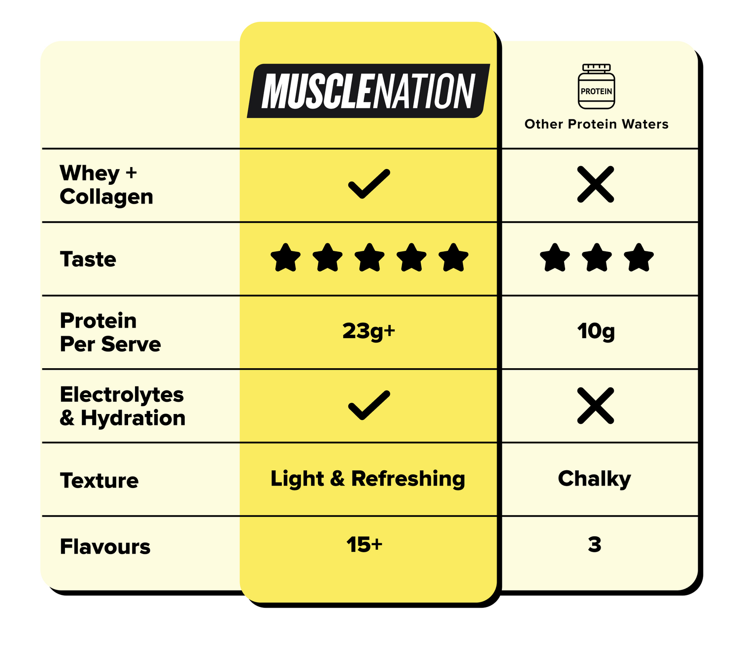 A refreshing clear protein water supplement which is a light alternative to the usual milky protein shake. With the benefits of protein, collagen, electrolytes and BCAA's, the Muscle Nation Protein Water is a fruity and thirst quenching drink to use any time of the day.