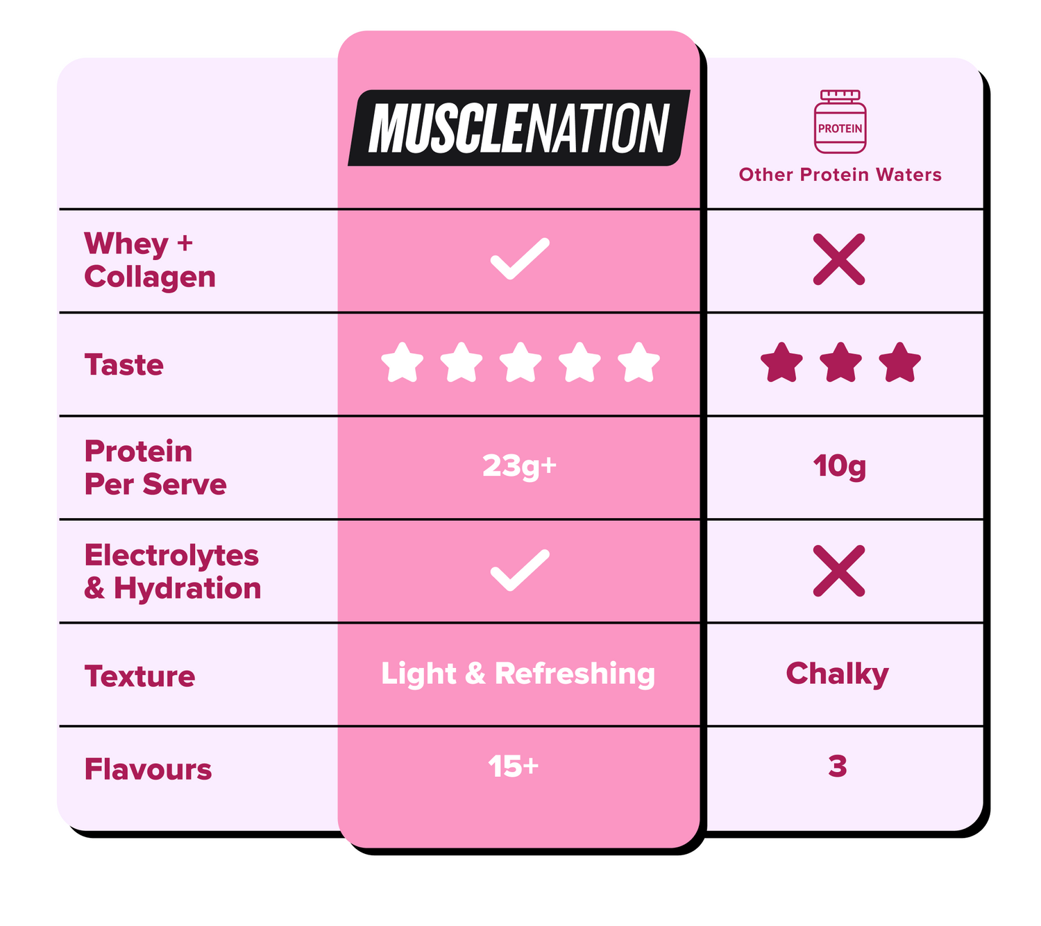 It's like drinking water, but fruity and refreshing! With the benefits of protein, collagen, electrolytes and BCAA’s, the Muscle Nation Protein Water is a fruity and thirst quenching drink to use any time of the day to help increase your protein intake.