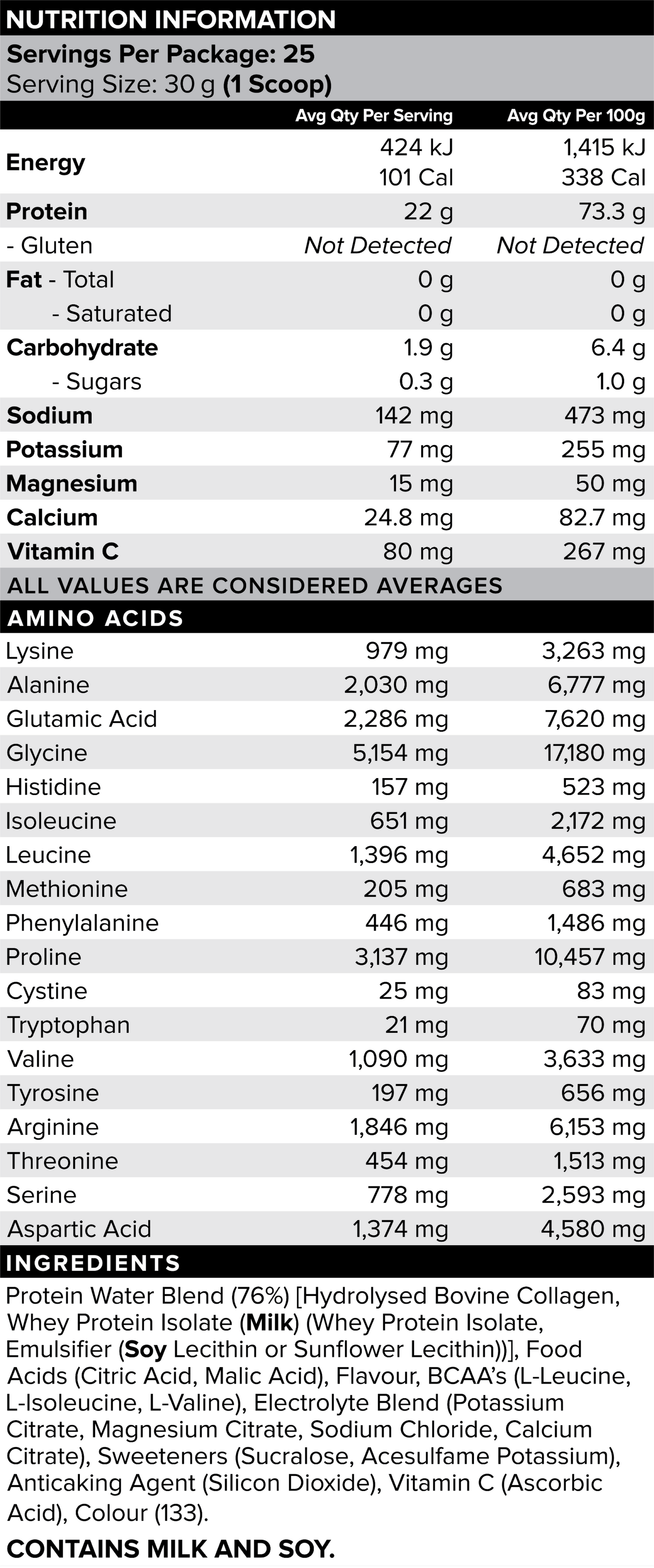 Ingredients: Protein Water Blend (83.5%) [Hydrolysed Bovine Collagen, Whey Protein Isolate (Milk) (Whey Protein Isolate, Soy or Sunflower Lecithin)], Food Acids (Citric Acid, Malic Acid), BCAA's 2:1:1 (L-Leucine, L-Isoleucine, L-Valine), Flavour, Sweeteners (Sucralose, Acesulfame Potassium), Electrolyte Blend (Potassium Citrate, Calcium Citrate, Magnesium Citrate, Sodium Chloride), Anticaking Agent (Silicon Dioxide), Vitamin C (Ascorbic Acid).