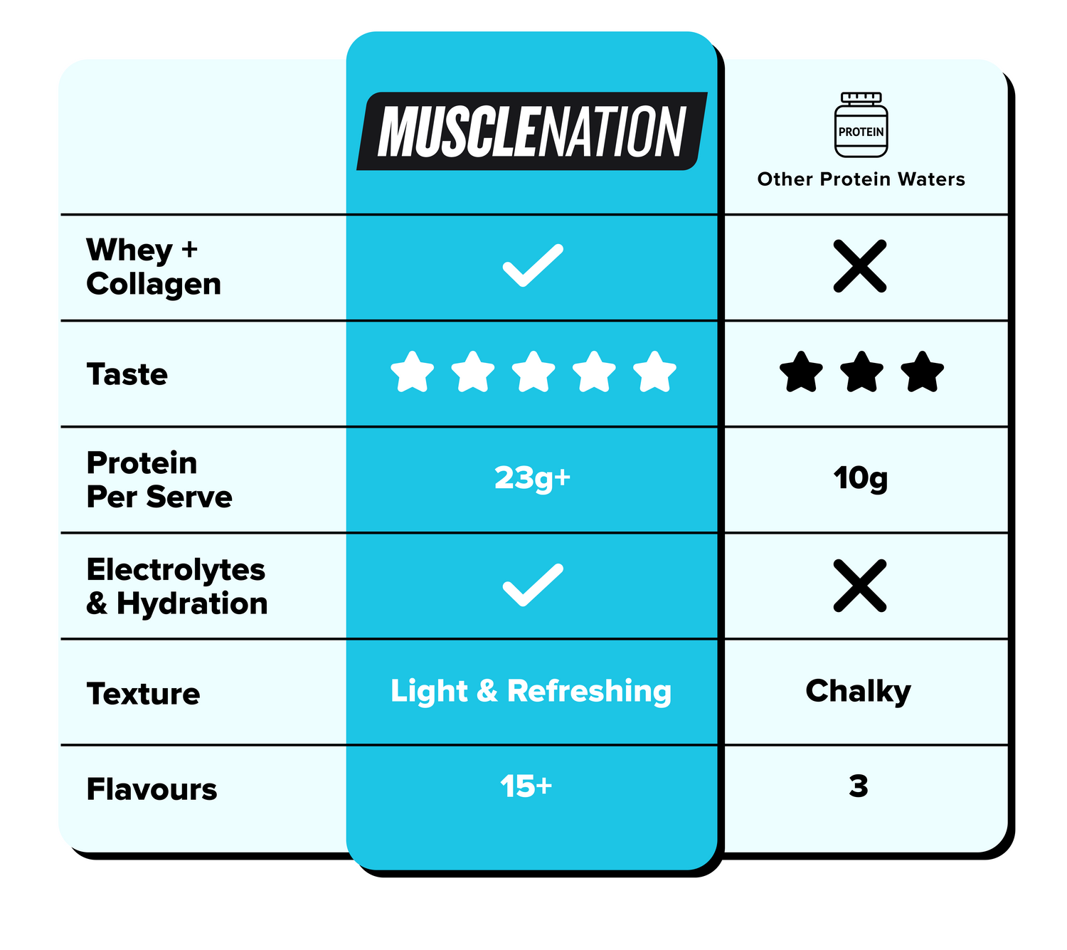 It's like drinking water, but fruity and refreshing! With the benefits of protein, collagen, electrolytes and BCAA’s, the Muscle Nation Protein Water is a fruity and thirst quenching drink to use any time of the day to help increase your protein intake.