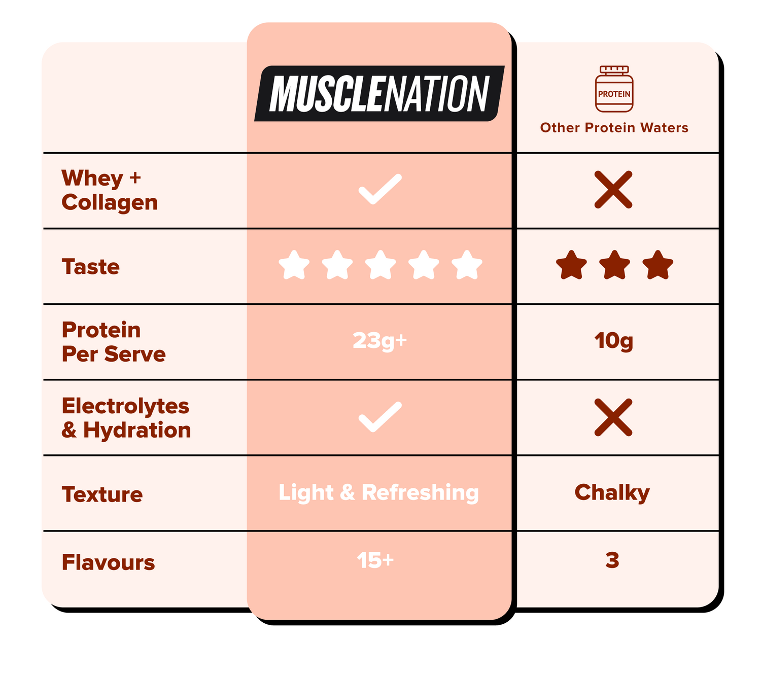 A refreshing clear protein water supplement which is a light alternative to the usual milky protein shake. With the benefits of protein, collagen, electrolytes and BCAA's, the Muscle Nation Protein Water is a fruity and thirst quenching drink to use any time of the day.