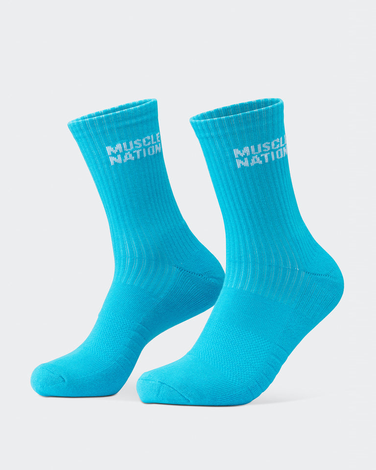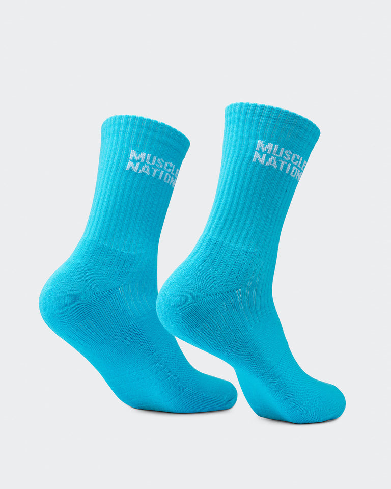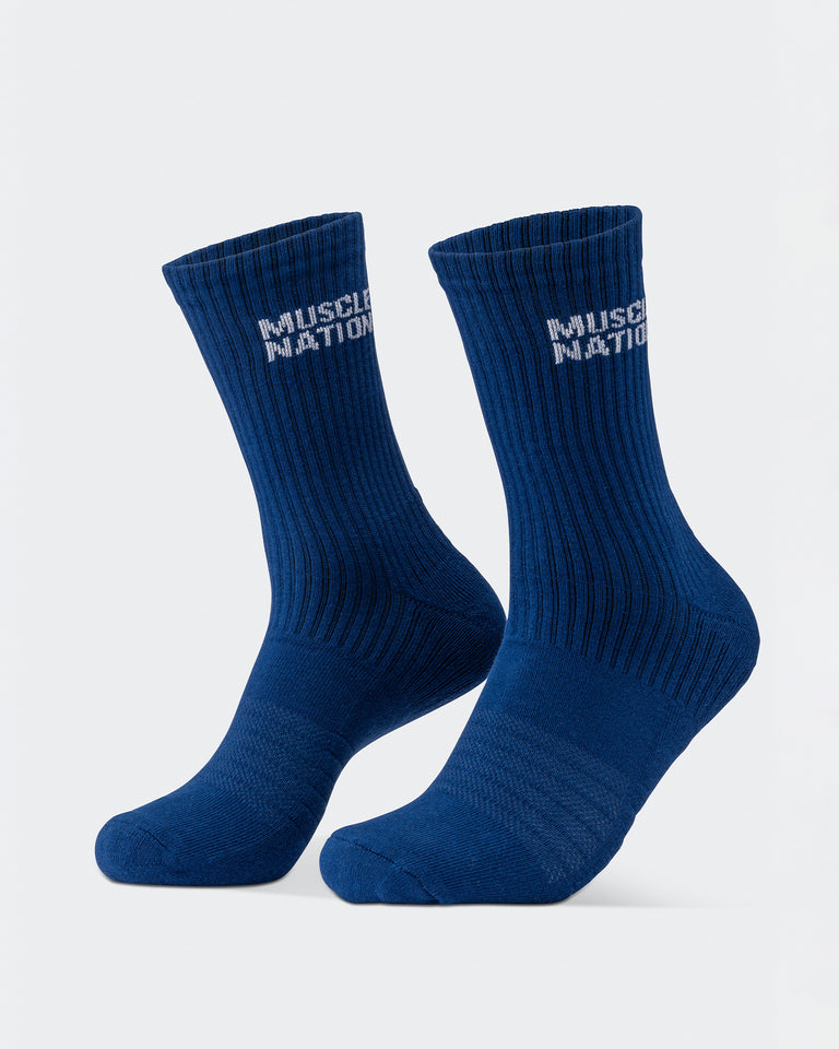Step up your sock game with Muscle Nation Essential Crew Socks. This 3-pack combines style and function with a classic crew length and signature MN branding. Made from a premium cotton blend, these socks offer just the right amount of cushioning and stretch for all-day comfort, whether you're hitting the gym or the streets. The perfect balance of performance and everyday wear - available in Navy, Hawaiian Blue and Off White.
