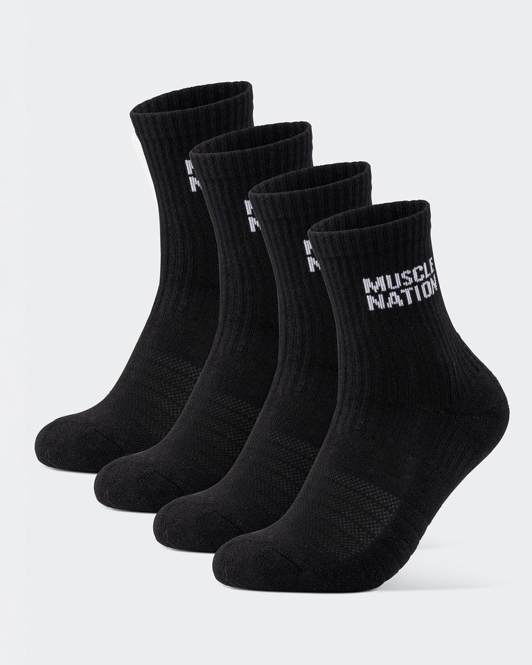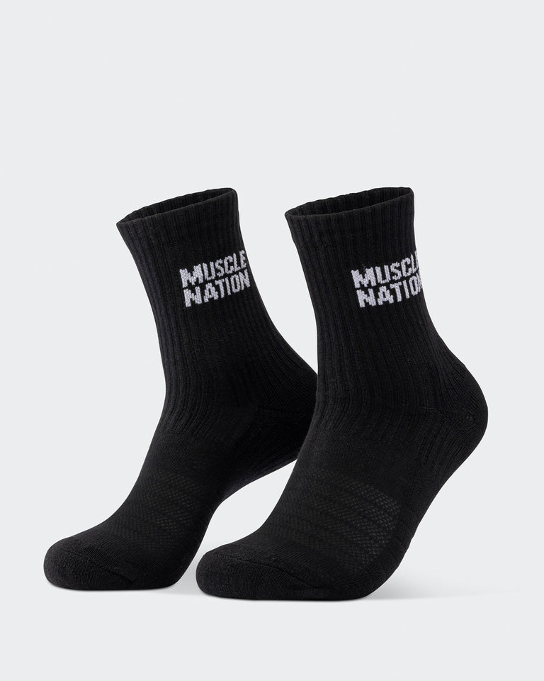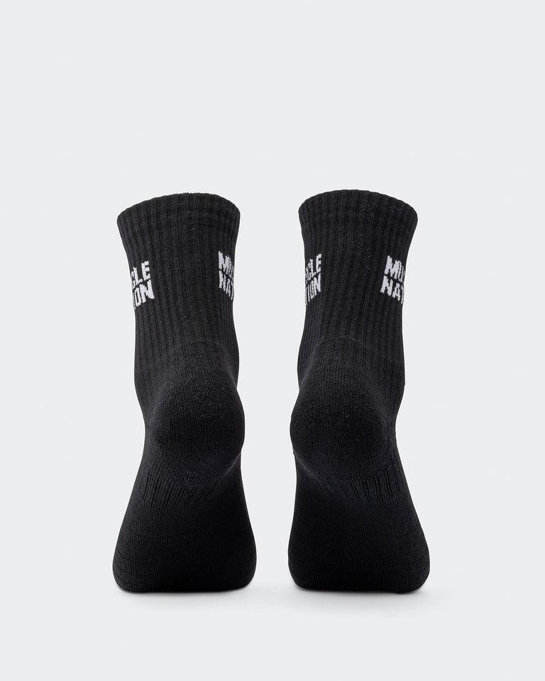 Step up your sock game with Muscle Nation Essential Crew Socks. This 2-pack combines style and function with a classic crew length and signature MN branding. Made from a premium cotton blend, these socks offer just the right amount of cushioning and stretch for all-day comfort, whether you're hitting the gym or the streets. The perfect balance of performance and everyday wear.