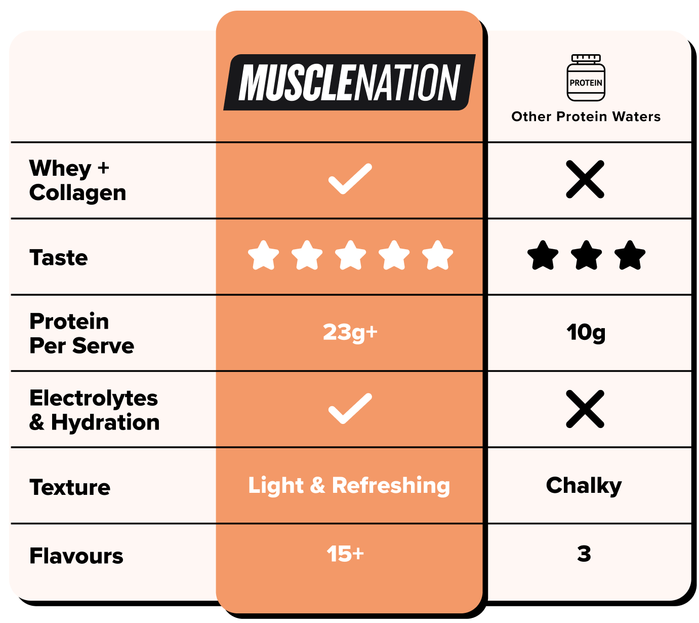 A refreshing clear protein water supplement which is a light alternative to the usual milky protein shake. With the benefits of protein, collagen, electrolytes and BCAA's, the Muscle Nation Protein Water is a fruity and thirst quenching drink to use any time of the day.