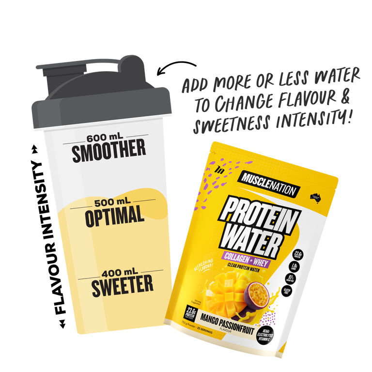 A refreshing clear protein water supplement which is a light alternative to the usual milky protein shake. With the benefits of protein, collagen, electrolytes and BCAA's, the Muscle Nation Protein Water is a fruity and thirst quenching drink to use any time of the day.