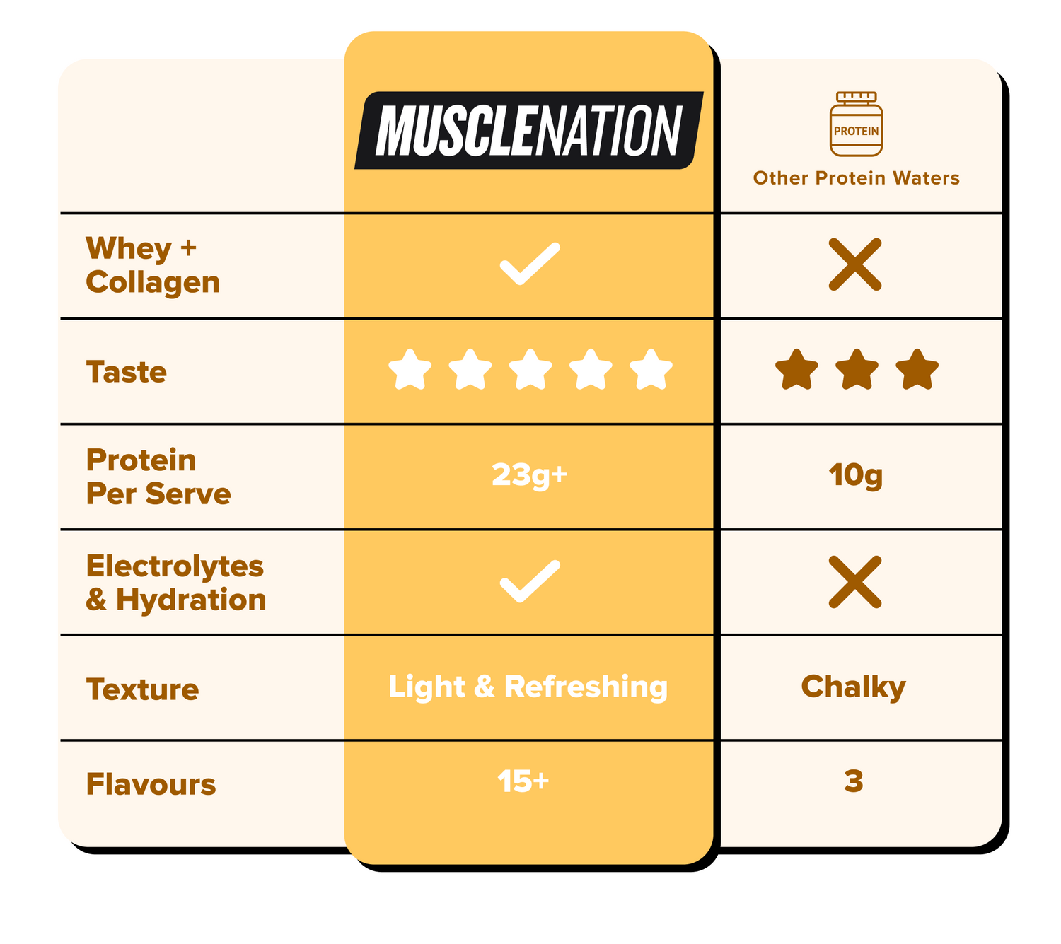 A refreshing clear protein water supplement which is a light alternative to the usual milky protein shake. With the benefits of protein, collagen, electrolytes and BCAA's, the Muscle Nation Protein Water is a fruity and thirst quenching drink to use any time of the day.