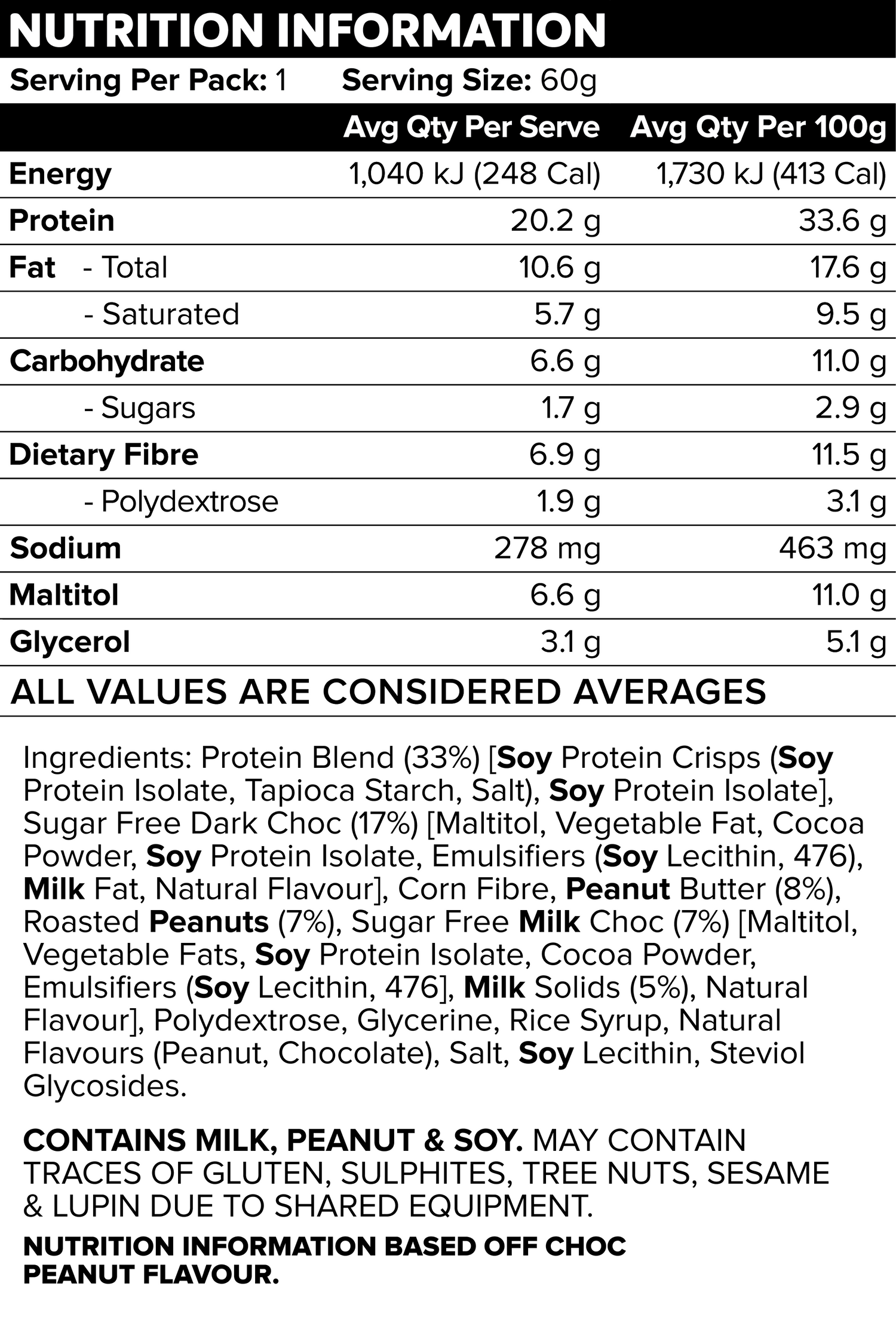 Nutrition and allergen information is specific to the Choc Peanut Butter flavour. For detailed allergen and nutritional information for other flavours, please visit the respective product pages.