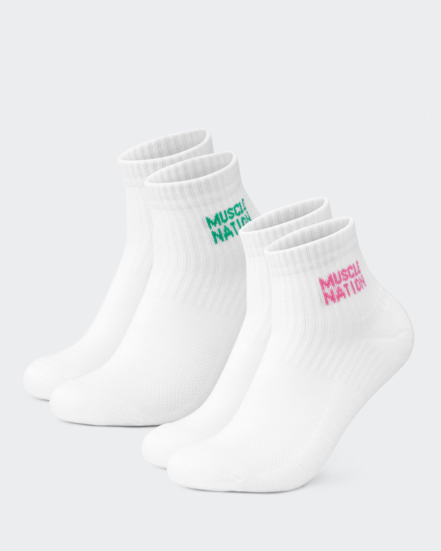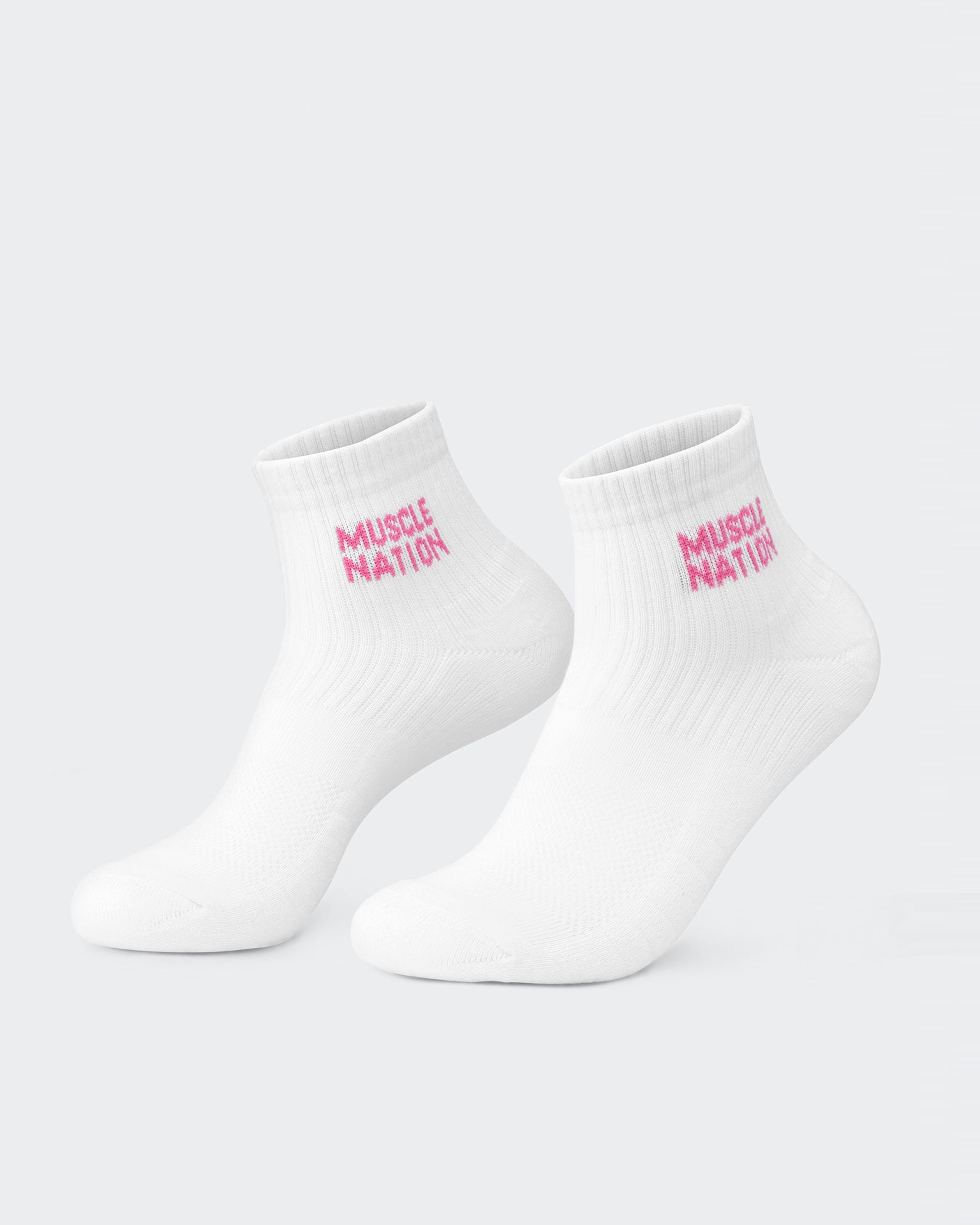 Complete your active look with our Women's 1/4 Crew Socks. This essential 2-pack features a versatile quarter-crew length that sits just above the ankle - perfect for both training sessions and everyday wear. Crafted from our premium cotton blend, these socks deliver the ideal balance of softness and support with light cushioning where you need it most. The signature Muscle Nation jacquard logo adds a subtle branded touch, while the durable construction ensures they'll maintain their shape and comfort through countless wears and washes.