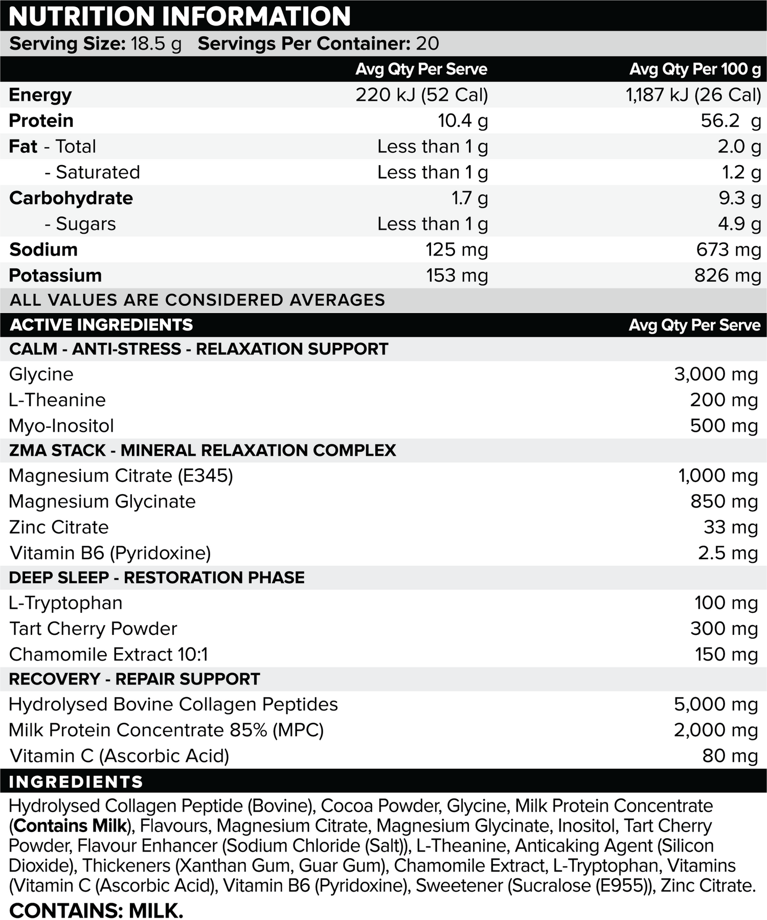DREAM is Muscle Nation's premium nighttime recovery formula in delicious Hot Chocolate flavour. It combines 3,000mg of Glycine, 5,000mg of Collagen, 200mg of L-Theanine, and other clinically studied ingredients to help you relax, fall asleep faster, and wake up feeling refreshed and restored, without melatonin or next-day grogginess.