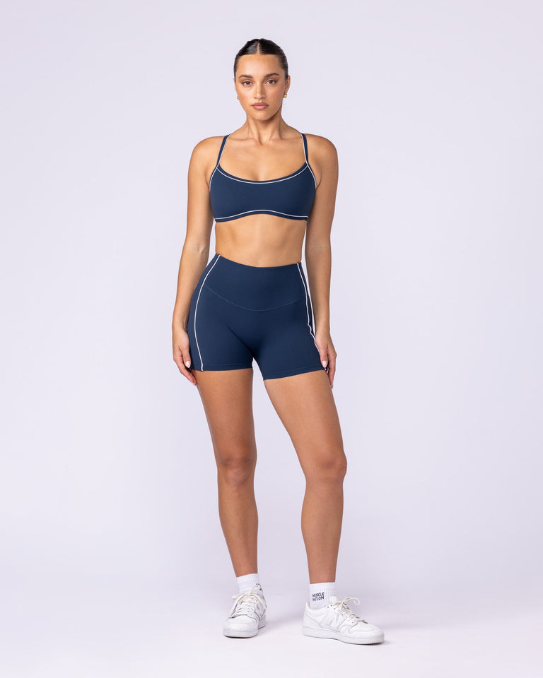 The Haze Bralette channels a fun retro energy with a sporty edge. Designed in a true to size fit, it features thin shoulder straps and a cross over detail at the back for a flattering, feminine touch. Finished with contrast piping detail and an MN logo on the side panel. Crafted from our soft and supportive Aura Fabric for a smooth, sculpted feel.