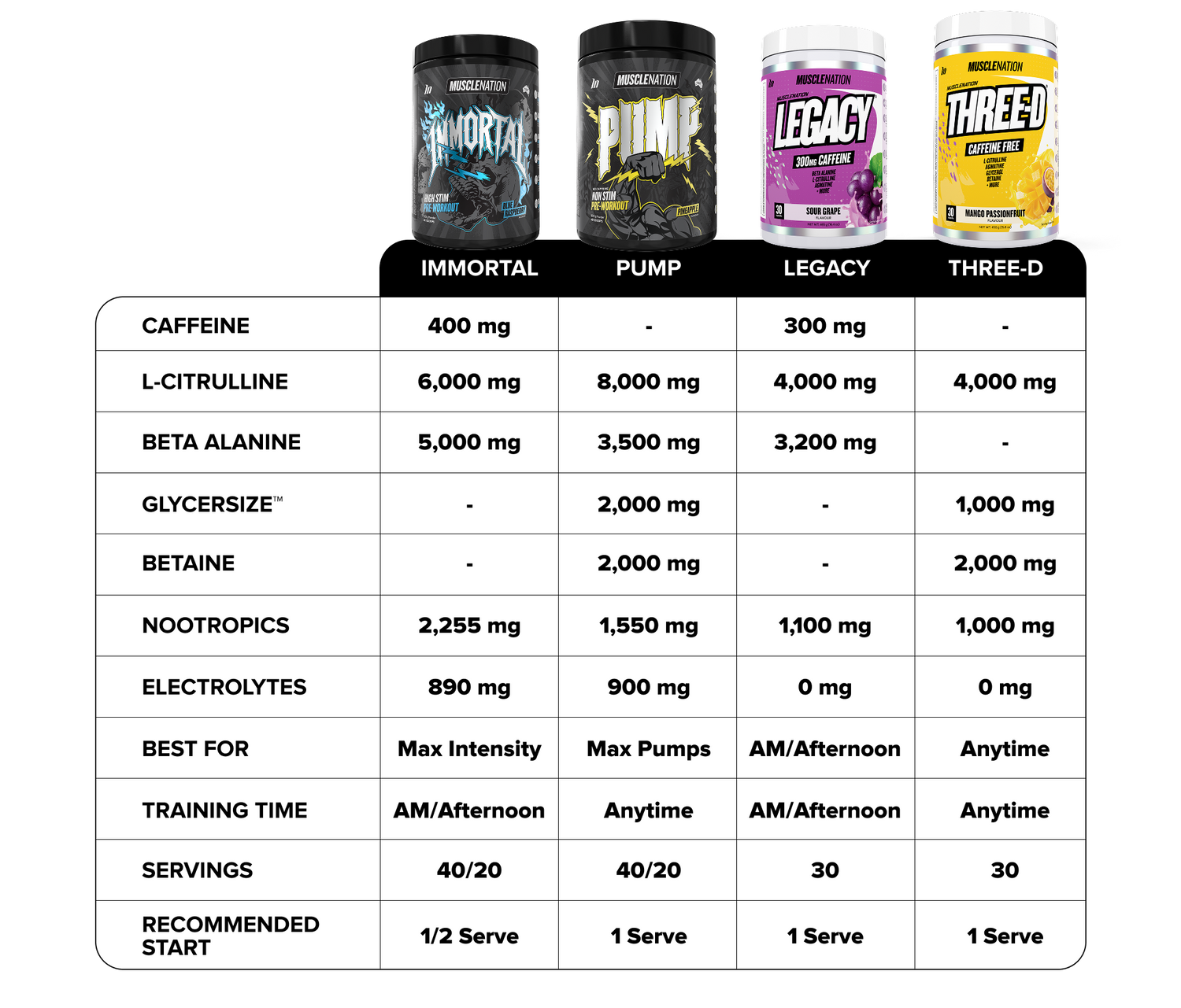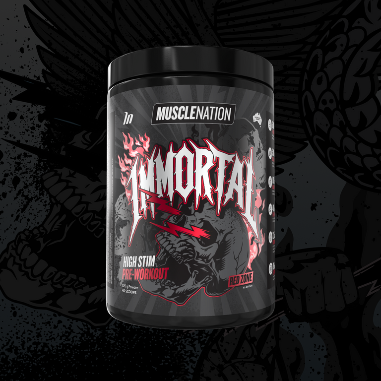 Immortal is Muscle Nation’s high-stimulant pre-workout built for serious athletes and advanced gym-goers who want hard-hitting, sustained energy. Each full-strength serve delivers 400mg of caffeine plus clinically dosed ingredients to support intense focus, muscle pumps, endurance, and performance.