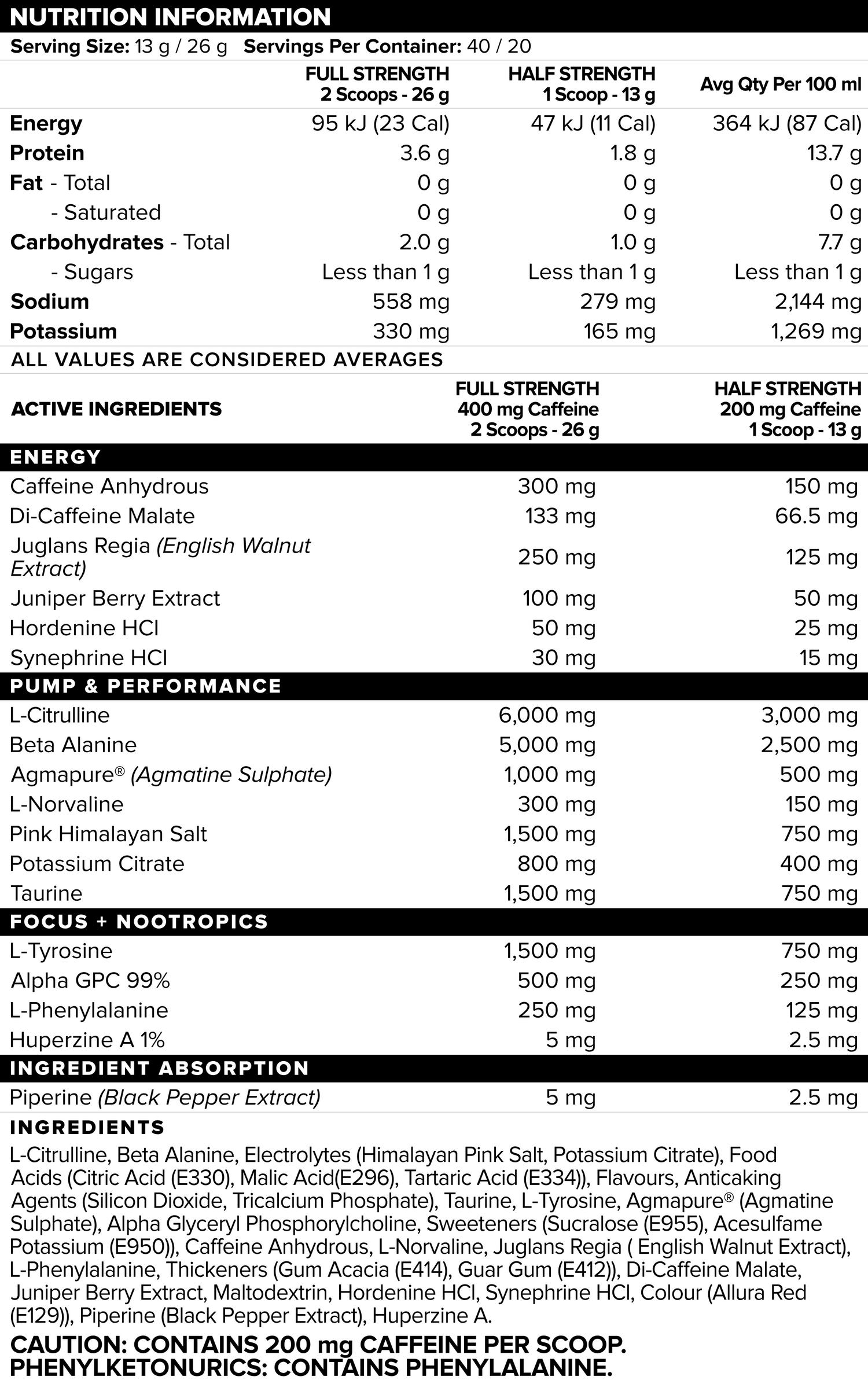 • 20 full-strength serves (2 scoops = 26g, 400mg caffeine)