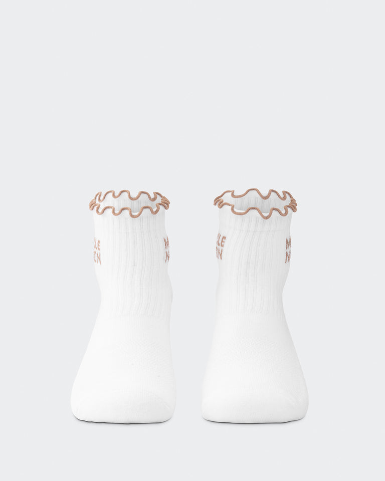 Add a playful touch to your active look with our Women’s Ruffle Crew Socks. Designed with a flattering quarter-crew length that sits just above the ankle, these socks are as cute as they are functional - perfect for both your workouts and off-duty days. Made from a soft cotton blend with light cushioning in all the right places, they provide all-day comfort and support. Finished with a delicate ruffle trim and our signature Muscle Nation jacquard logo, these socks are the perfect blend of style and performance.