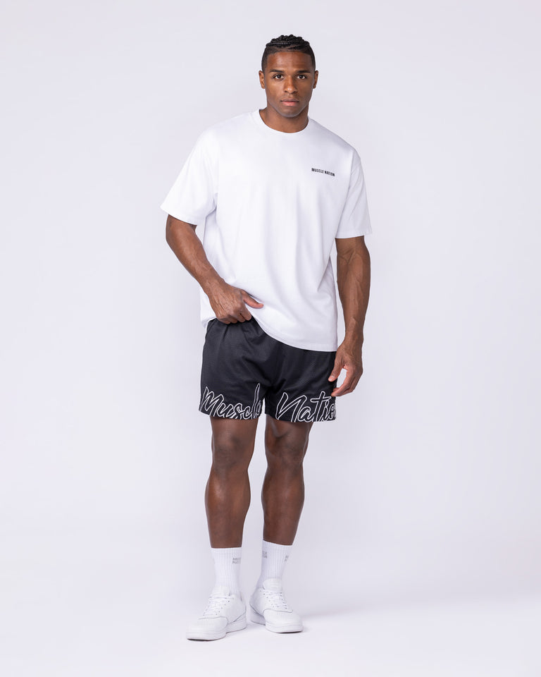 Take your training to the next level with the Script Lay Up 4" Shorts. Designed for movement, these shorts feature a relaxed fit and breathable Strike Mesh fabric with a soft polyester jersey lining for added comfort. The encased elastic waistband with external drawcords ensures a secure fit, while side pockets add functionality. Finished with bold Muscle Nation script embroidery across the front legs, these shorts bring a classic street-sport look to your active rotation.